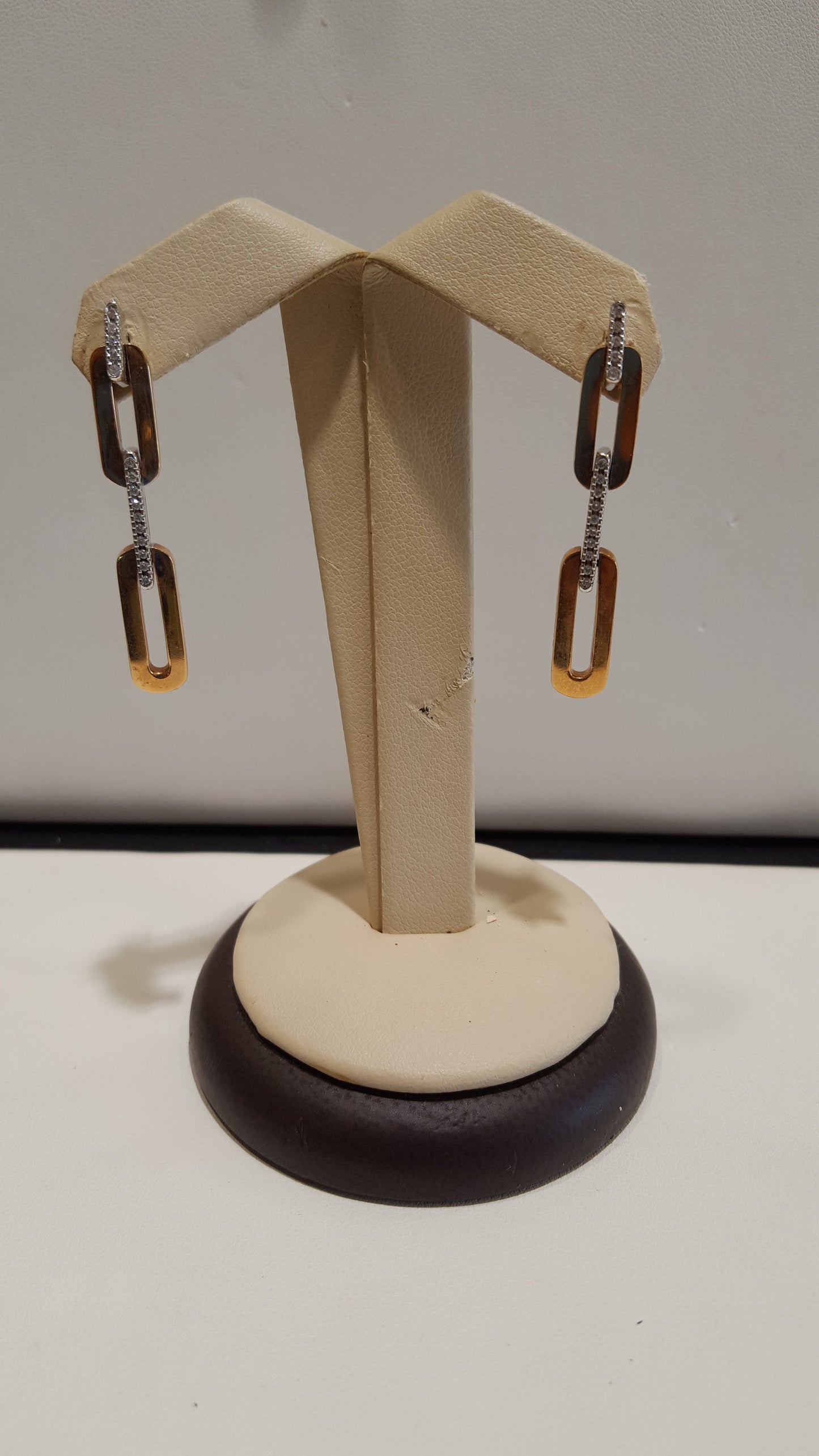 These earrings are available in gold. The diamonds have a total carat weight of 0.16 carats.