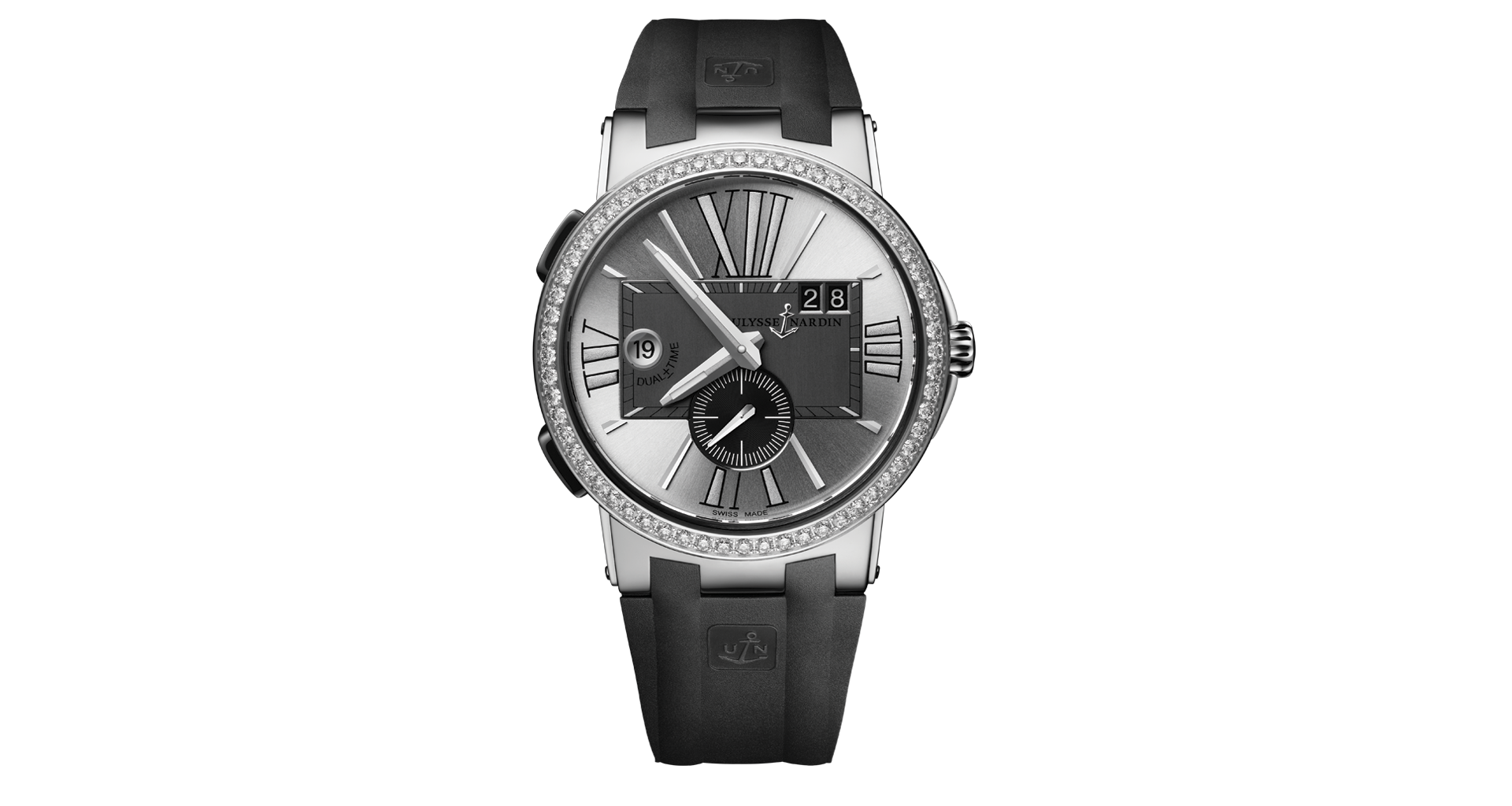 Stainless steel case set with 60 diamonds with ceramic bezel and pushers.