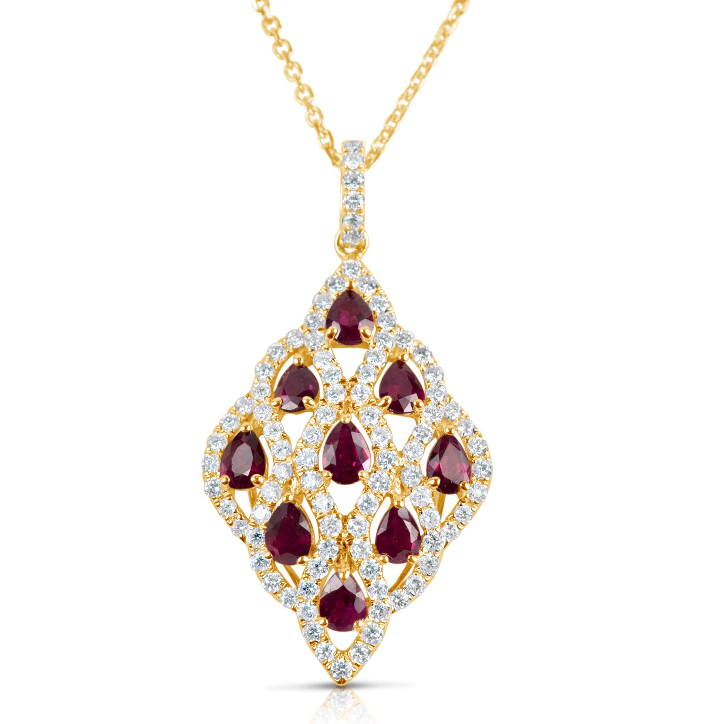 This ruby and diamond pendant is available in gold. The centerstone may be special-ordered in any precious gemstone color.The pear shape ruby in this pendant have a total carat weight of 1.80 carats. The diamonds have a total carat weight of 0.76 carats.