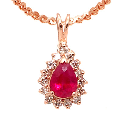 This ruby and diamond pendant is available in gold. The centerstone may be special-ordered in any precious gemstone color.The pear shape ruby in this pendant has a total carat weight of 0.76 carats. The diamonds have a total carat weight of 0.30 carats.