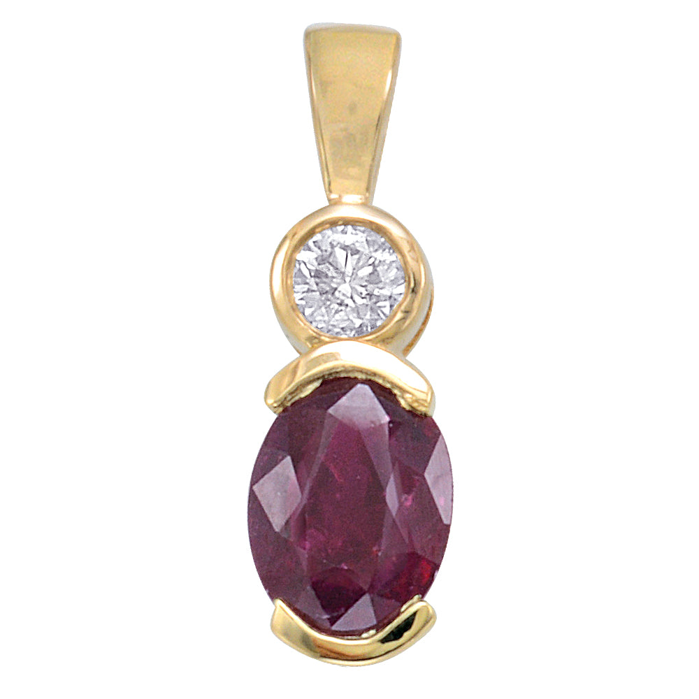 This ruby and diamond pendant is available in gold. The centerstone may be special-ordered in any precious gemstone color. The oval ruby in this pendant has a total carat weight of 1.48 carats. The diamonds have a total carat weight of 0.14 carats.