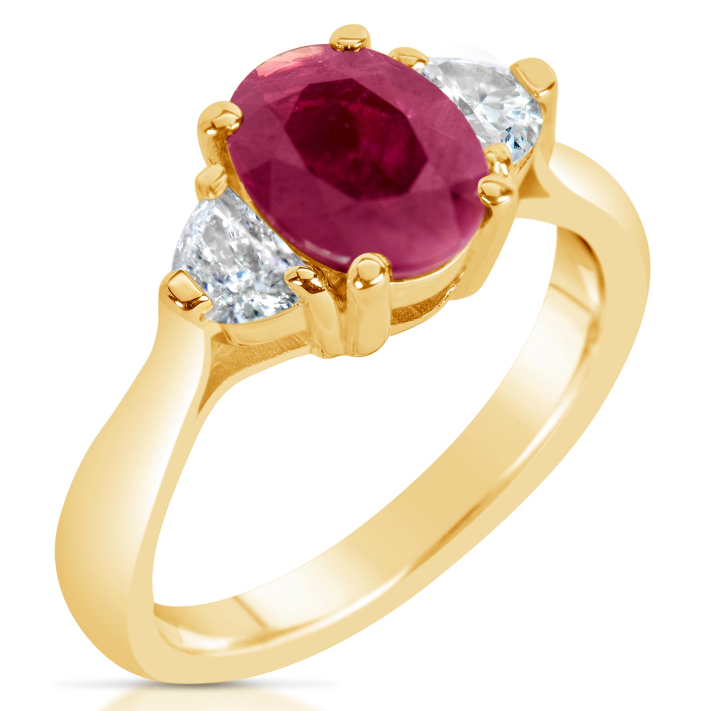 This ruby and diamond ring is available in gold. The centerstone may be special-ordered in any precious gemstone color.The oval ruby in this ring has a total carat weight of 1.76 carats. The diamonds have a total carat weight of 0.41 carats.
