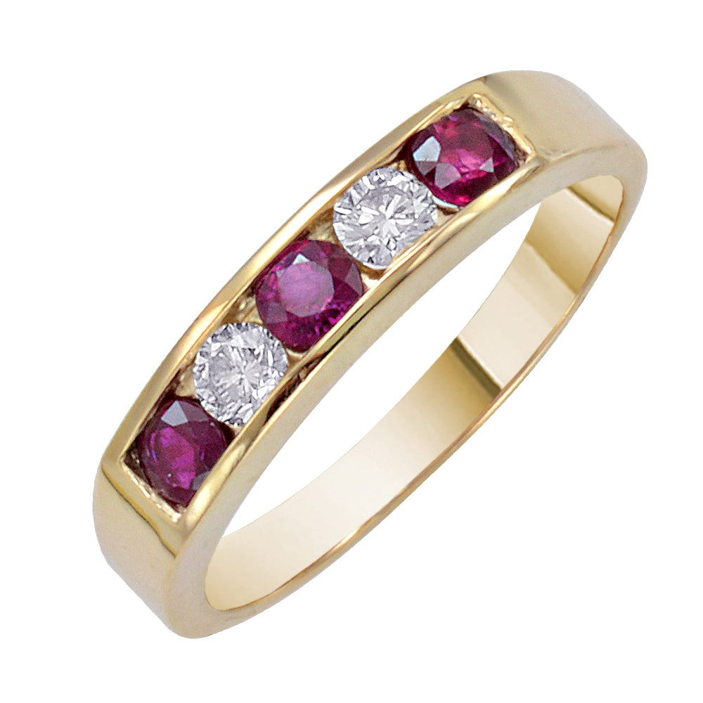 This ruby and diamond ring is available in gold. The centerstone may be special-ordered in any precious gemstone color. The round ruby in this ring has a total carat weight of 0.51 carats. The diamonds have a total carat weight of 0.20 carats.