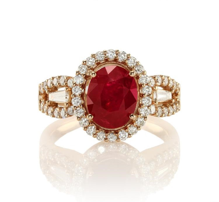 This ruby and diamond ring is available in gold. The centerstone may be special-ordered in any precious gemstone color.The oval ruby in this ring has a total carat weight of 2.71 carats. The diamonds have a total carat weight of 0.84 carats.