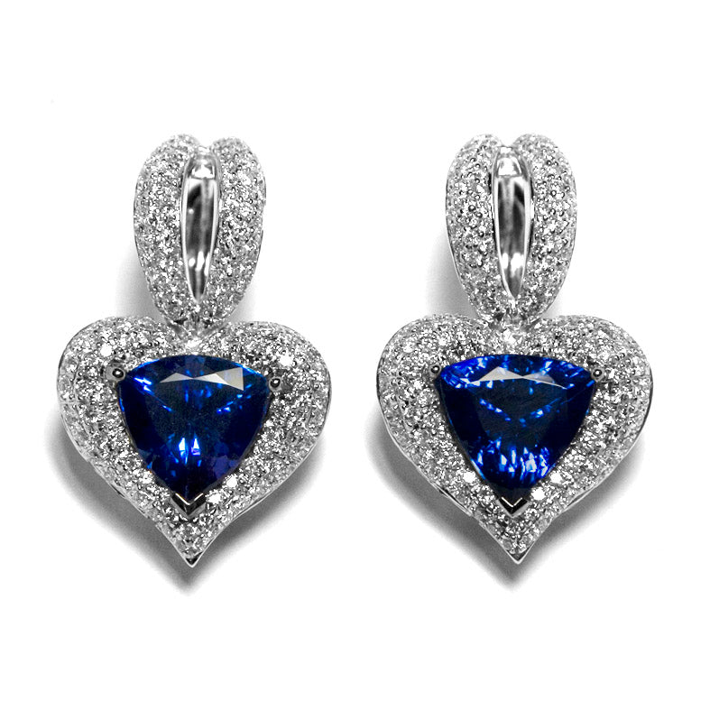 These tanzanite earrings are available in 18K white gold. The centerstone may be special-ordered in any precious gemstone color. The trillion tanzanite in these earrings have a total carat weight of 4.60 carats. The diamonds have a total carat weight of 2.06 carats.