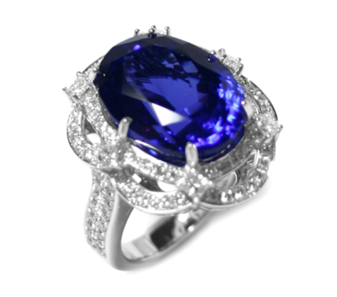 This tanzanite and diamond ring is available in gold. The centerstone may be special-ordered in any precious gemstone color. The oval tanzanite in this ring has a total carat weight of 10.86 carats. The diamonds have a total carat weight of 1.02 carats.