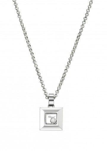 At the very heart of Chopard's women's jewelry line, the Happy Diamonds Icons line is as original as it is timeless. Inspired by sparkling drops of water in a waterfall, the freely moving diamond held between two sapphire crystals on this square-shaped pendant in 18k white gold swirls and dances, creating a cascade of light.
