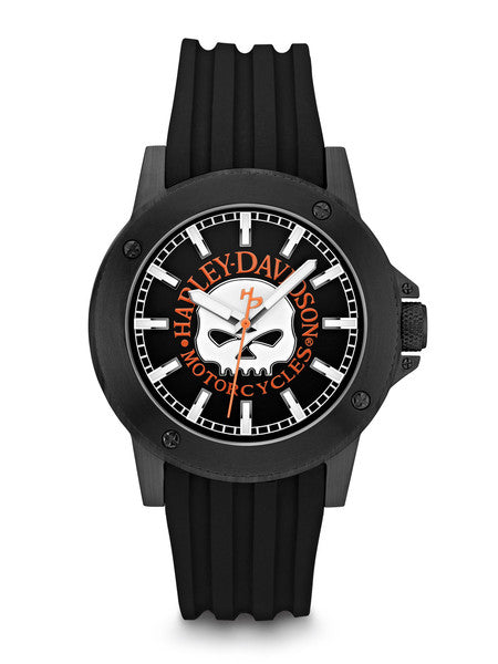 From the Decals Collection. Black dial with Willie G Skull logo. Silver luminous hands and markers. Orange second hand with signature H-D counterweight. Stainless steel case with black ion plating and screw-head accents. Screw back. Patterned black silicone strap.