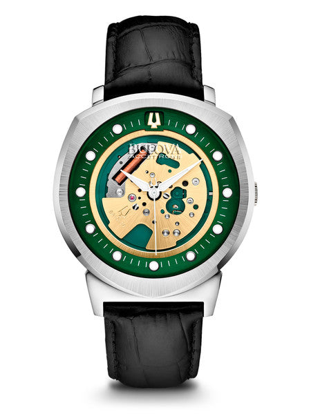 From the Alpha Collection. Crafted of stainless steel, stylized Alpha case, curved K-1 mineral glass crystal, gold and green open-movement dial, green anodized aluminum dial ring, luminous hands and markers, second hand, four-screw caseback, recessed crown, black leather strap, and double-press deployant closure. Powered by Bulova's exclusive high performance quartz movement with a frequency of 262 kHz for unparalleled accuracy.