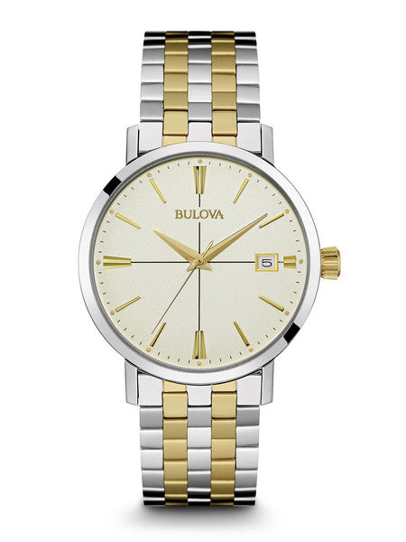 From the Classic collection. In stainless steel with silver-tone and gold-tone finish, cream dial, multi-link two-tone bracelet, double curved mineral glass, 3 hand calendar, and deployant closure.