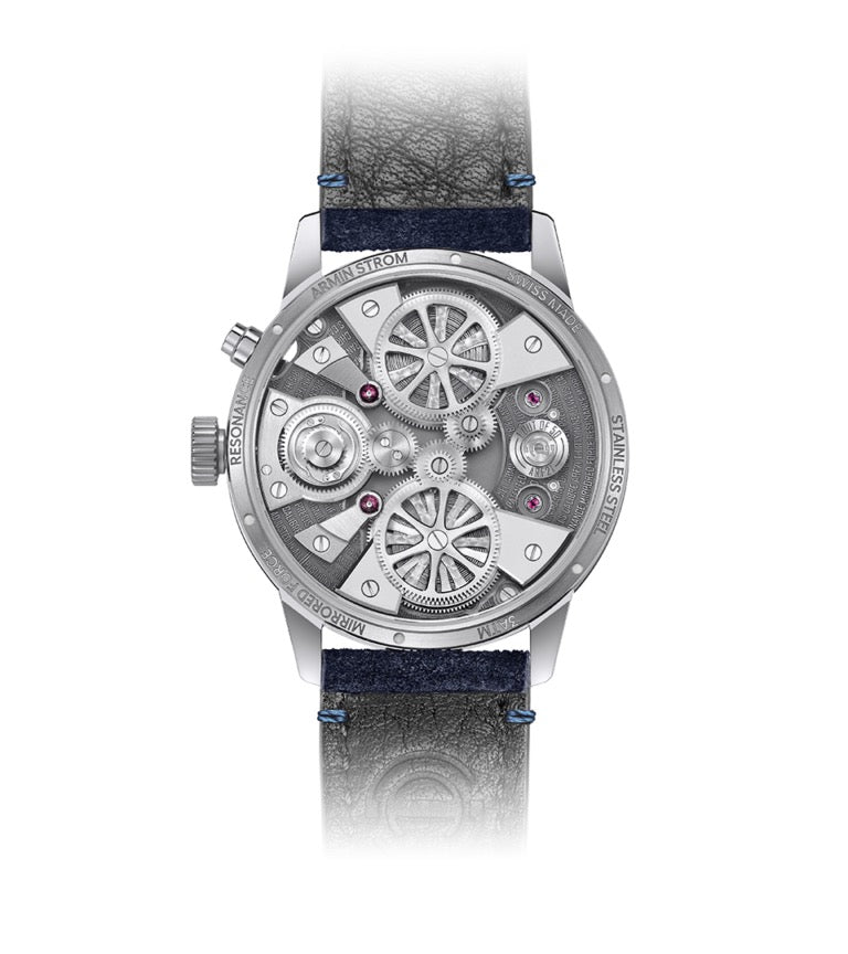Mirrored Force Resonance Manufacture Edition Blue is our take on a fascinating watchmaking phenomenon: resonance. This physical effect has captivated watchmakers since the 17th century. It occurs when two balances oscillate next to each other. They then regulate each other through their emitted vibrations. In theory, this produces significantly more reliable timing rates, aka greater chronometric stability. In reality, and especially in watches, maintaining resonance is very challenging. Wrist movements or minor shocks can easily disrupt it. We created our patented system to solve this problem. It makes resonance more stable and less prone to disturbances. With this, we have achieved something rare: introducing reliability into the unpredictable world of physics.