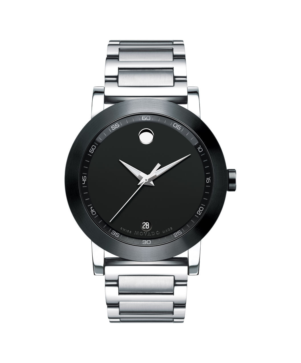 Men's Museum Sport watch, 42 mm stainless steel case with black PVD-finished round bezel, black 3-hand dial with matching minute reflector ring, silver-toned dot and luminescent hands, and date display, stainless steel link bracelet with deployment clasp.