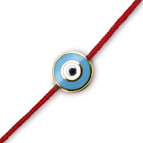18K Gold, Evil Eye Red Cord Bracelet, Light Blue Enamel Round.