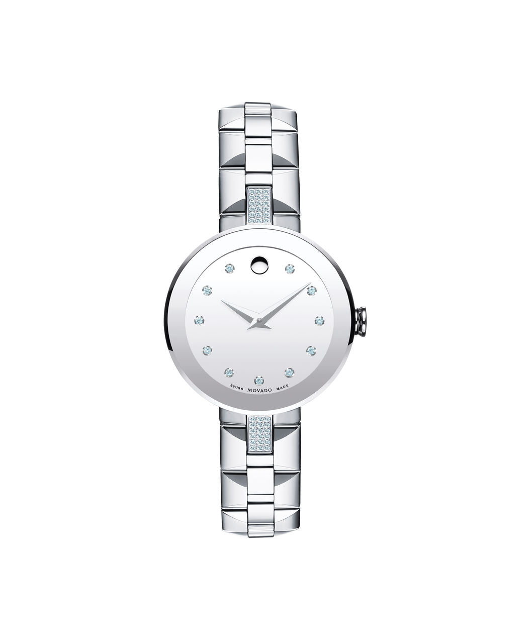 Women's Sapphire watch, 28 mm stainless steel bezel-free case with flat edge-to-edge sapphire crystal and 36 north/south diamond accents, round silver mirror dial with 11 diamond markers, silver-toned dot and hands, (0.183 t.c.w. diamonds), stainless steel pyramid-shaped link bracelet with butterfly deployment clasp.