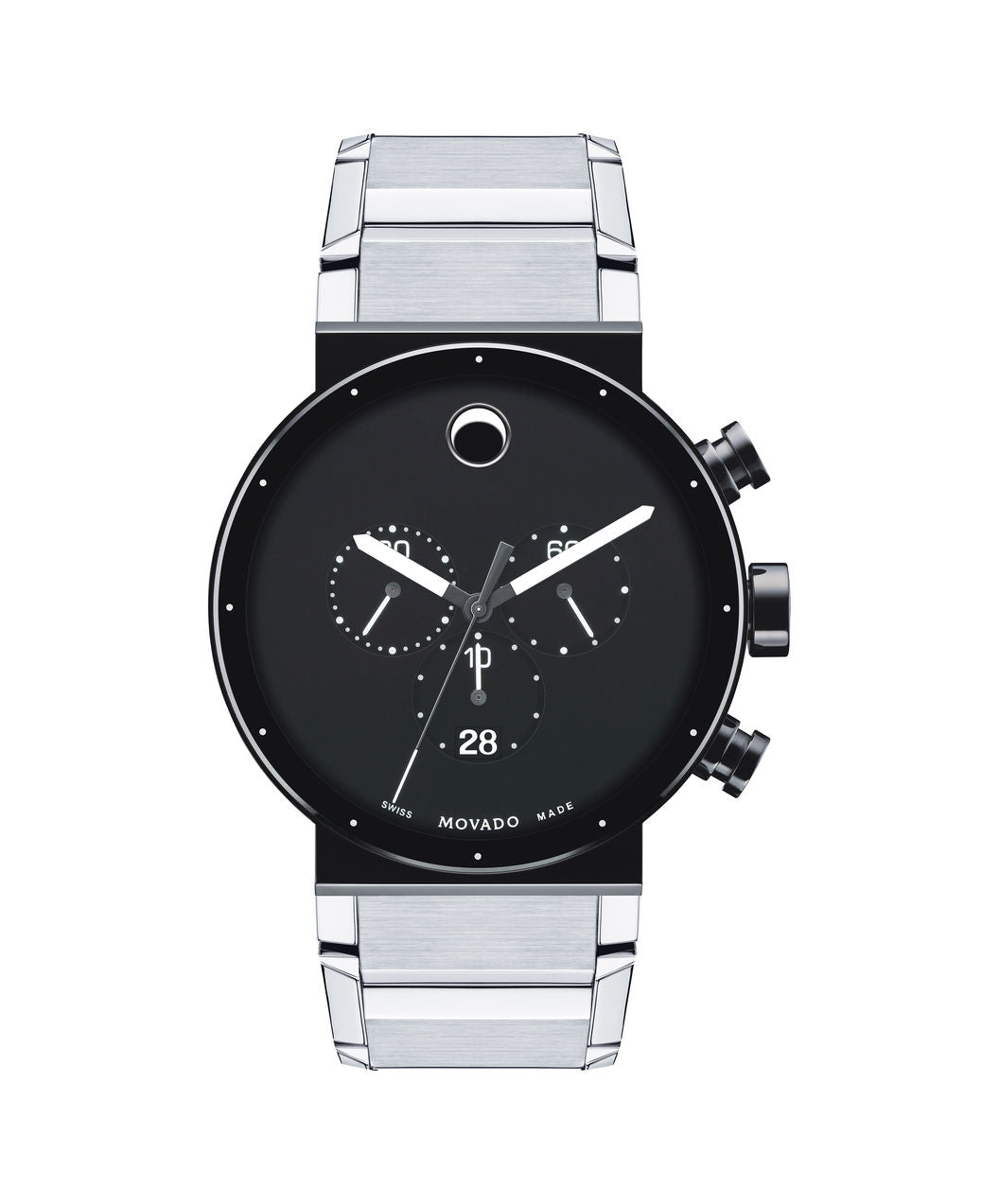 Men's Sapphire Synergy chronograph, 42 mm black PVD-finished and stainless steel bezel-free case with flat edge-to-edge sapphire crystal and white dot hour index, round black dial with 3 matching timing subdials, shiny black signature dot, and white hands and dot indices, stainless steel link bracelet with push-button deployment clasp.
