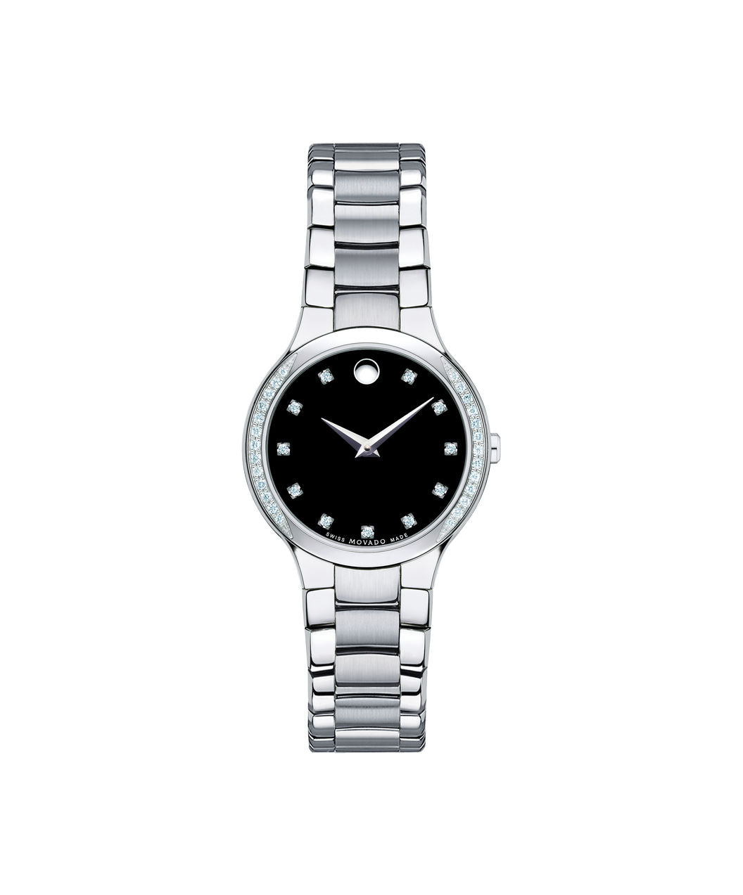 Women's Serio watch, 26 mm stainless steel case with 26 diamonds, round black dial with 11 diamond markers, silver-toned dot and hands, (0.168 t.c.w. diamonds), stainless steel link bracelet with deployment clasp.